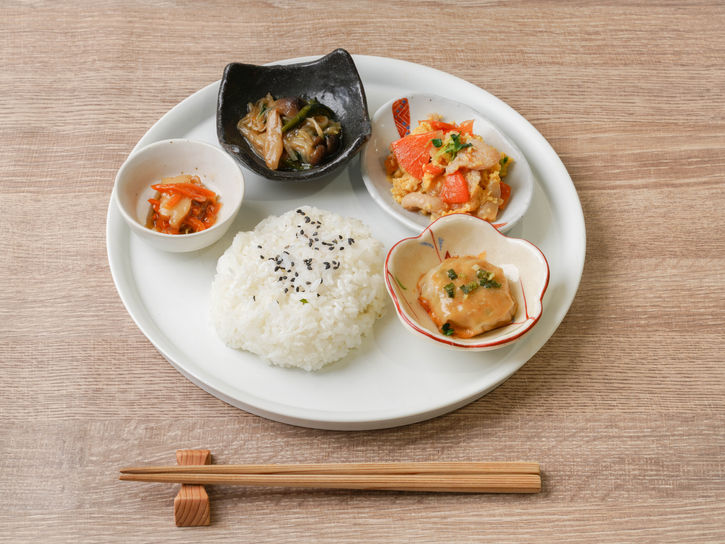 一食の中で,主食・主菜・副菜が揃い,野菜がたっぷりで食塩のとり過ぎにも配慮した食事のことです。